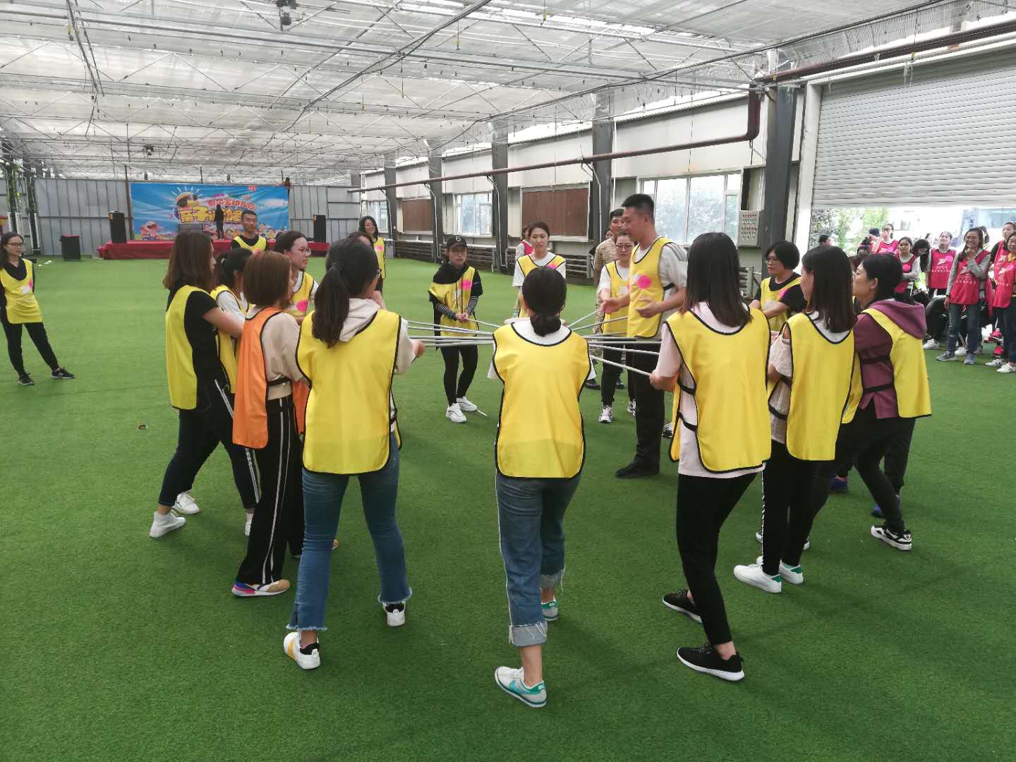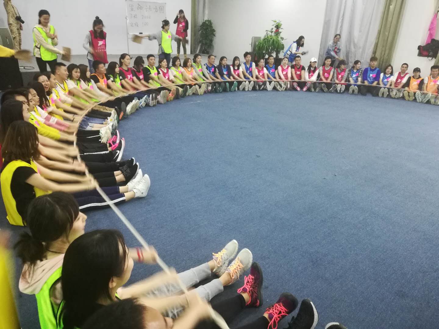 正式的素质拓展活动分为四个部分,分别为蛟龙出海、击鼓颠球、百人长城以及动感生命圈。这四部分活动均需要同学们积极配合,合理分工,要求同学们在短时间内发挥自己的优点和聪明才智,才能完美地完成任务。如百人长城这一项目要求全体同学紧密的围成圆圈,在教练的指令下,每为同学都要坐在后一位同学的腿上并支撑着前方同学,并进行集体的行走移动。随着一项项集体活动的进行,同学们之间渐渐建立起了信任与互相支持的信念,最终在动感生命圈活动中完成了百人摇绳3500圈的挑战任务。