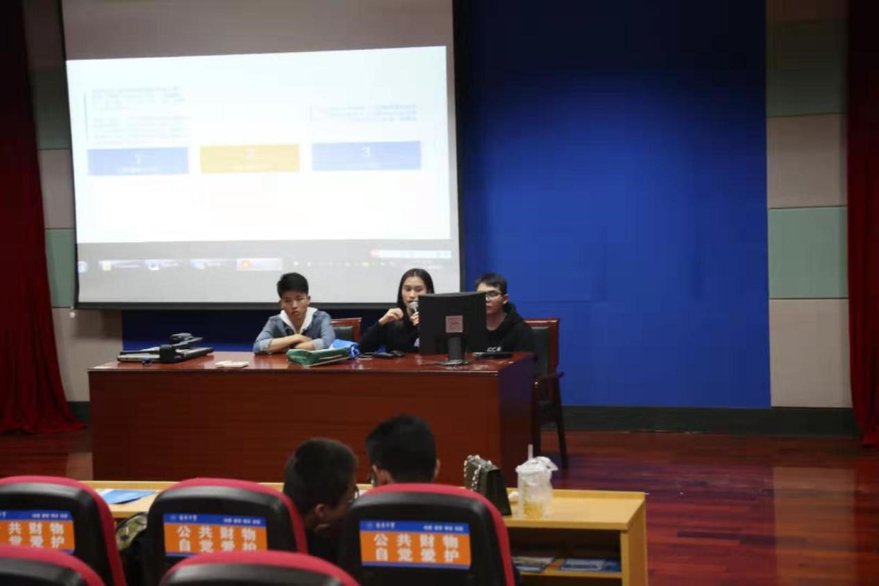 第一部分是宣讲小组成员依照学校招生办提供的ppt内容进行招生宣传。建设工程学院的陈玉慧同学负责拍照记录宣讲活动过程。其中ppt中的“吉大简介”、“吉大校友”、“人才培养”部分内容由37000cm威尼斯曾小雅同学负责介绍,在介绍的同时提醒学弟学妹们看看下发的学校招生宣传手册了解2018年37000cm威尼斯海南招生情况。通信工程学院的符逸凡同学介绍“国际合作”、和“就业升学”部分。在场的同学们对37000cm威尼斯升学和就业满意度之高产生了很大的兴趣。因为南方同学对于北方学校环境的好奇,宣讲小组中的经济学院卓道熹同学还在ppt中加入了学校的学习生活环境部分介绍。吉大南校让同学们生活更加便利和丰富多彩的日新楼,以及鼎新图书馆完善的设备良好的环境等,让到场的学弟学妹们对北方学校环境不好的刻板印象有所改观。