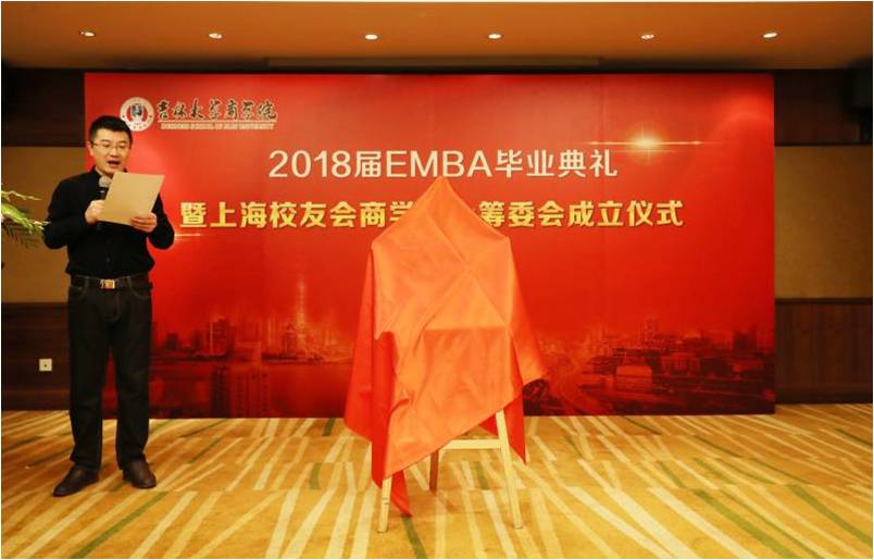 在全体与会嘉宾、领导、校友会筹委会成员及2018届EMBA一班学员的共同见证下,举行了庄重的校友会筹委会揭牌仪式。梁志平副院长宣读了吉大上海校友会商学分会筹委会名单;筹委会代表胡啸鹰校友、黄颖校友、李三号校友分别介绍了筹委会成立的过程及筹委会下一阶段的重点工作。