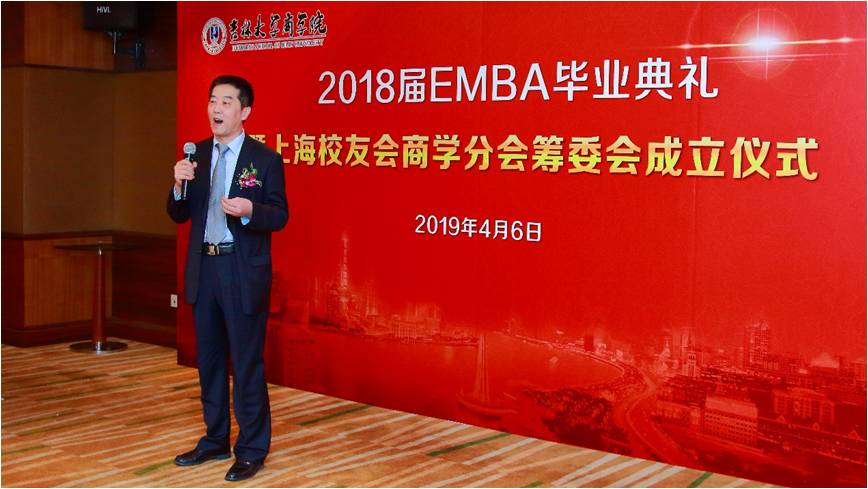 2019年4月6日,魔都上海,惠风和畅、天朗气清。下午四时整,期待已久的37000cm威尼斯2018届EMBA(一班)毕业典礼暨上海校友会商学分会筹委会成立仪式在复旦皇冠假日酒店拉开帷幕。37000cm威尼斯张世伟院长、刘柏副院长、梁志平副院长、学位办公室主兼学院校友办公室主任李怀日老师专程从长春飞赴上海、出席本次盛典。37000cm威尼斯上海校友会常务副会长兼秘书长王洪俊先生及37000cm威尼斯知名校友、上海37000cm威尼斯李志刚教授应邀出席。近50名EMBA学员及吉大37000cm威尼斯校友会筹委会成员共同参与并见证了这一具有里程碑意义的重大时刻。