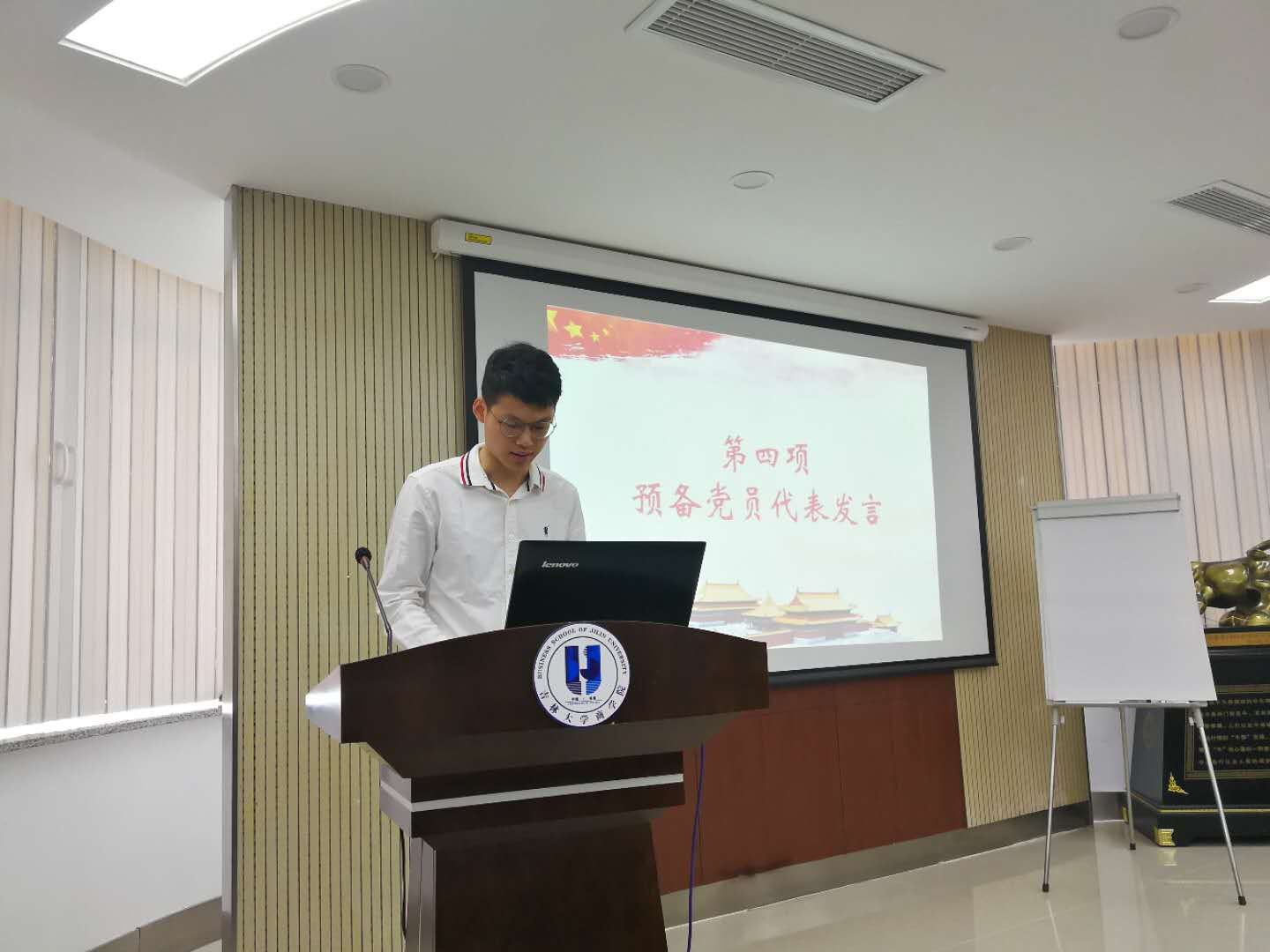 大会第五项,预备党员代表王璇同志发言,他提到每一名新入党的预备党员都应该以新的身份严格要求自己,将党规党章作为人生的准则,永远保持先进性和纯洁性。