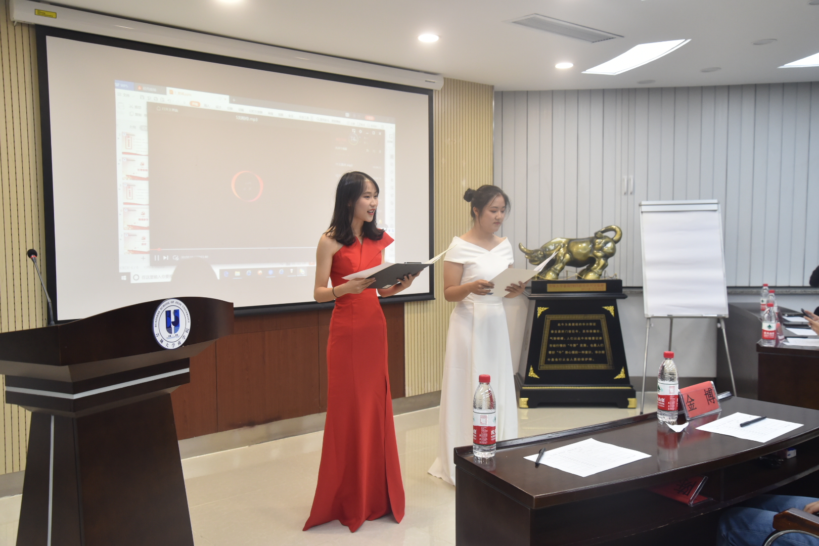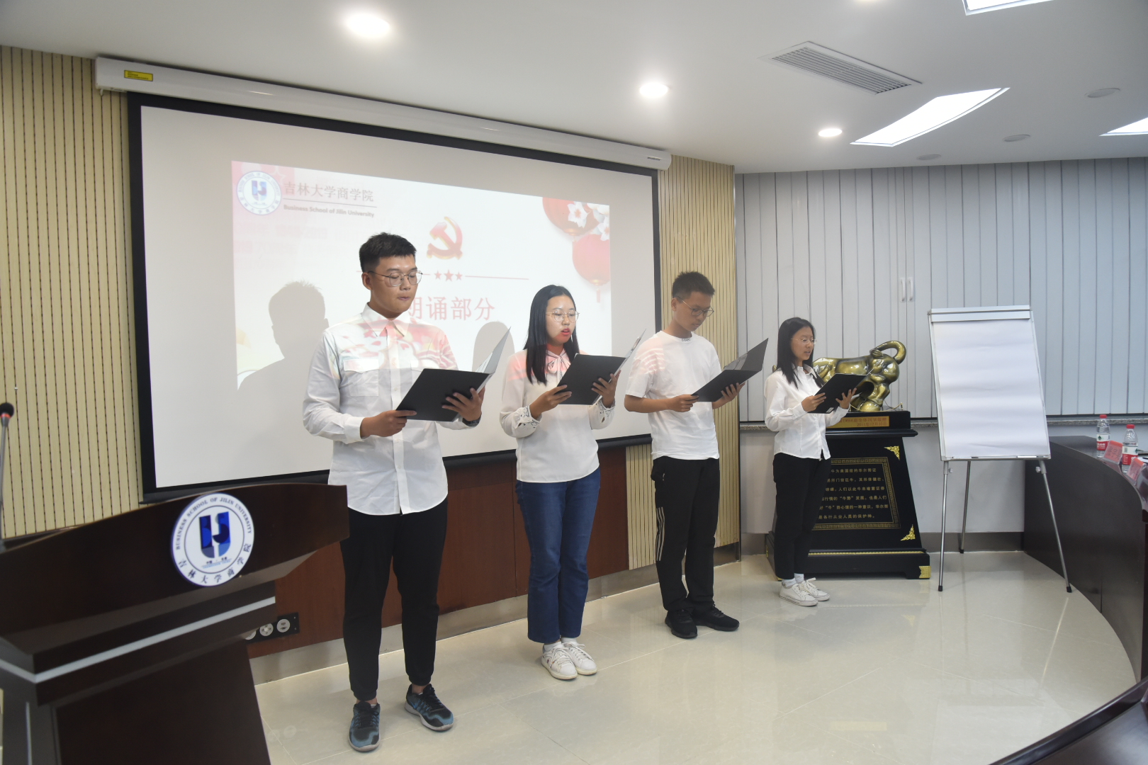 最后金博老师上台发言,表扬了参赛同学们今天的优秀表现,赞赏了大家的爱国热情,希望大家再接再厉,做一名优秀的商院人,一名优秀的吉大人,一名优秀的中国人!至此,“我以热情,赞颂祖国”主题朗诵比赛圆满结束。